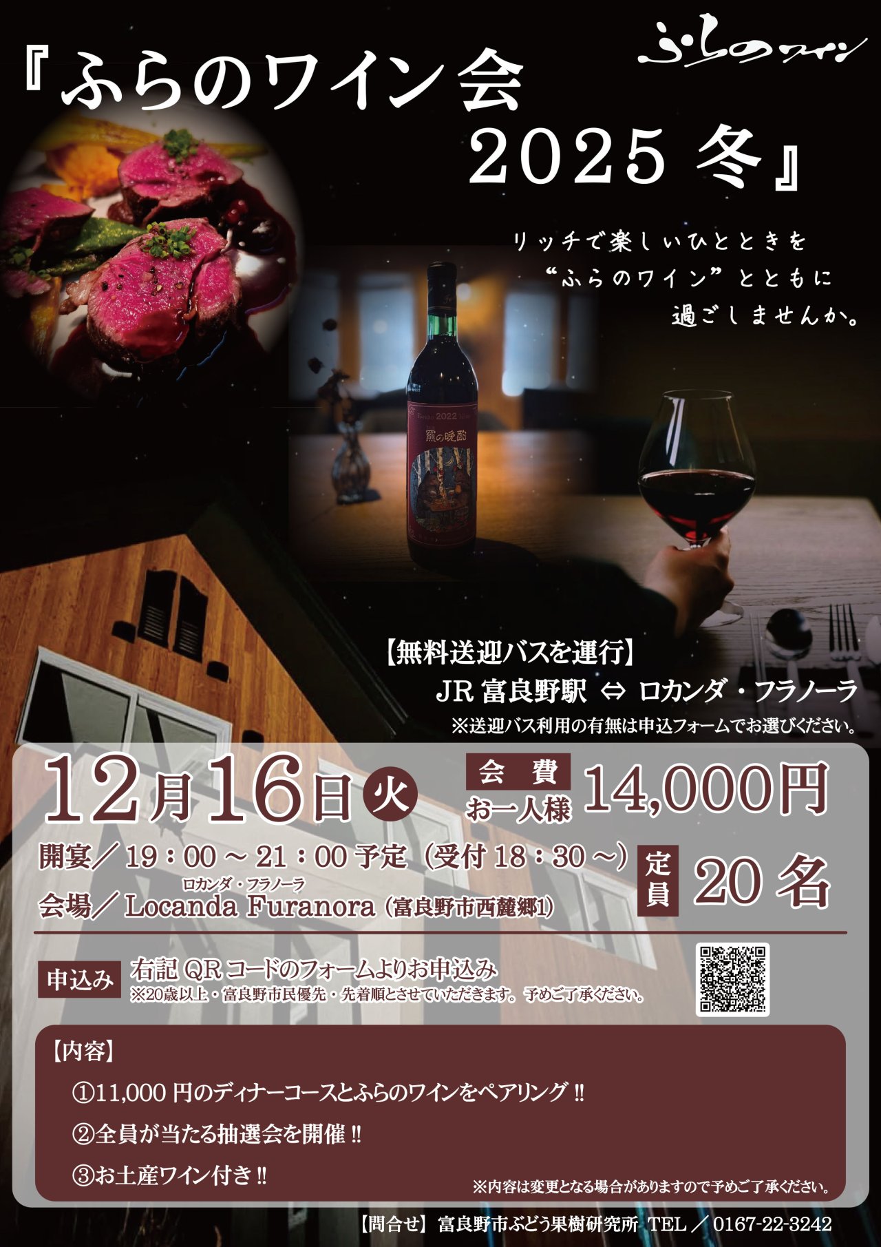 内 容:北海道や富良野産食材を使用した料理とふらのワインのペアリング・抽選会 ほか